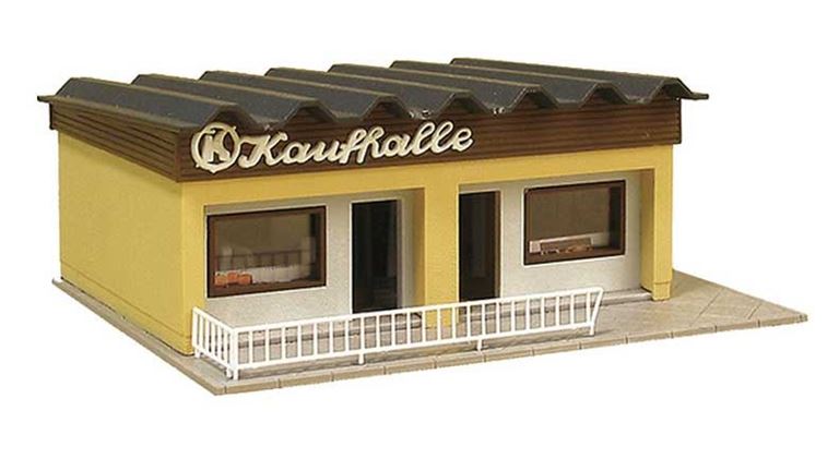 Масштабная модель мини-маркета «KAUFHALLE» из цветного пластика для самостоятельной сборки. Окраска модели не требуется. Размеры: 130 × 105 × 50 мм. Клей в набор не входит. Рекомендуется для диорам в масштабе 1/87 и железнодорожных макетов типоразмера Н0 (1:87).
