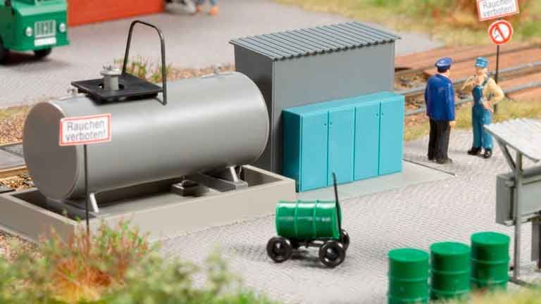 Использование небольших тепловозов в маневровой работе на железнодорожных станциях или в промышленных операциях, начавшееся в 1930-х годах, требовало соответствующих очистных сооружений. Эта подлинная модель цистерны, модернизированной в 1960-х годах, с топливным баком, защищенным от непогоды топливным насосом, вагоном для хранения масла и смазочных материалов, идеально сочетается с нашим сараем AUHAGEN 11429.
