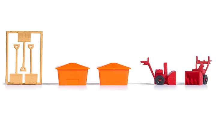 Масштабные модели для уборки снега (снегоуборочная машина, лопата для снега и контейнер для песка) из цветного пластика. Окраска модели не требуется. Рекомендуется для диорам в масштабе 1/87 и железнодорожных макетов типоразмера Н0 (1:87).