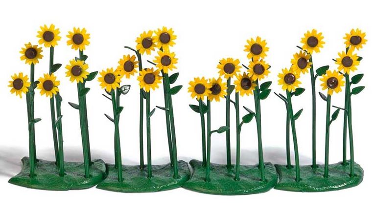 Набор подсолнухов. В наборе 24 штуки, высота от 16 до 22 мм. Рекомендуется для железнодорожных макетов типоразмера H0. Для установки рекомендуется использовать клей. Возможно размещение в любом месте макета или диорамы.