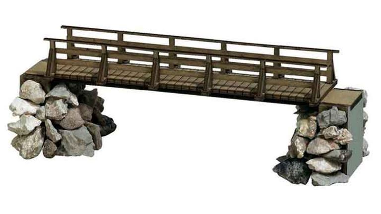 Комплект для универсального пешеходного моста из натурального дерева с каменным фундаментом. Цветные деревянные элементы идеально отражают конструкцию моста. Деревянные доски пола имеют реалистичную текстуру дерева, а перила моста с поручнями также идеально выполнены. Мост опирается на бетонный фундамент с обеих сторон, который может быть облицован поставляемым щебнем.