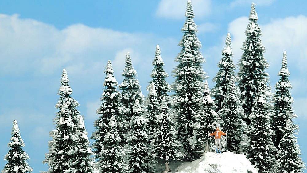Набор моделей хвойных деревьев в снегу. В наборе 20 деревьев высотой ~60—135 мм. Рекомендуется для железнодорожных макетов типоразмера H0, TT, N и Z. Для установки деревьев рекомендуется использовать клей. Возможно размещение в любом месте макета или диорамы.