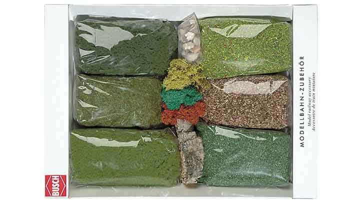 Травянистый флок, различные присыпки, мох, Korksplit, камни, исландский мох, пробковая кора.