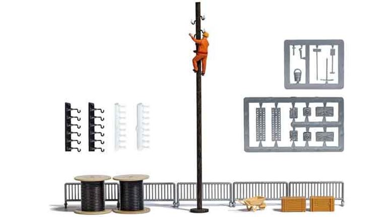 Масштабный модельный набор из окрашенных элементов и фигуры «Монтёр-электрик ремонтирует линию на столбе» из пластика рекомендуется для диорам в масштабе 1/87 и железнодорожных макетов типоразмера Н0 (1:87). Окраска фигур не требуется.