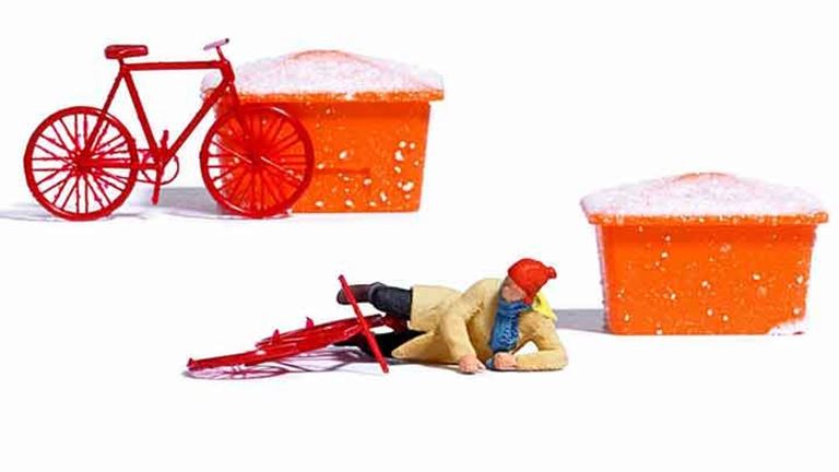 Упавшая на трассе велосипедистка, 2 велосипеда и 2 контейнера со снегом.
