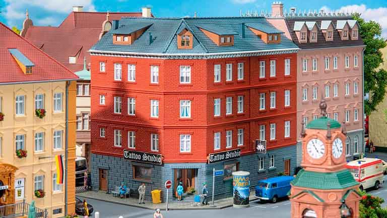 Коллекционный набор «Угловой дом с «Tattoo Studio» из цветного пластика для самостоятельной сборки рекомендуется для диорам в масштабе 1/87 и железнодорожных макетов типоразмера Н0 (1:87). Размер: ~210 x 155 x 185 мм. Окраска модели не требуется.