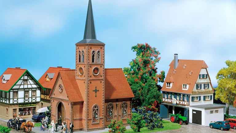 Модель католической церкви из цветного пластика для самостоятельной сборки. Размер 200 × 118 × 270 мм. Рекомендуется для железнодорожных макетов типоразмера H0. Клей в набор не входит. Возможно размещение в любом месте макета или диорамы.