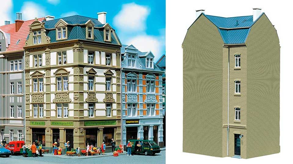 4-этажный таунхаус с мансардными окнами и лепным декором. На первом этаже расположен магазин. Соответствует модели "Гетештрассе" (FALLER 130915).