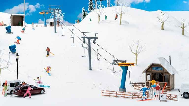 Воспоминания детства или беззаботная атмосфера лыжного дня могут быть творчески преобразованы в зимний пейзаж на макете железной дороги H0 с помощью классического Т-образного подъемника и множества соответствующих аксессуаров, таких как две кабины подъемника, снежные пушки, ограждения и скамейки.