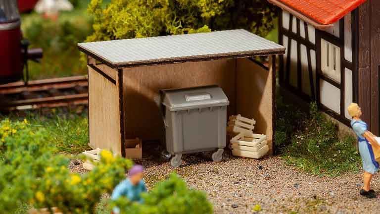 Масштабная модель «Навес для мусорного бака с контейнером для вторсырья» (Lasercut) для самостоятельной сборки. Окраска модели не требуется. Размеры: ~40 × 25 × 25 мм. Клей в набор не входит. Рекомендуется для диорам и железнодорожных макетов в масштабе 1:87 типоразмера Н0.