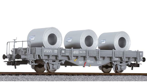 Масштабная модель 2-осного железнодорожного вагона платформы для рулонной стали гружёная металлопрокатом произведена в полном соответствии оригиналу в историческом и техническом плане. NEM 362 с закрытым механизмом сцепления (KK-Kinematik). Длина по буферам ~138 мм. Окраска модели не требуется. Рекомендуется для железнодорожных макетов, диорам и миниатюр в масштабе 1/87 типоразмера H0.