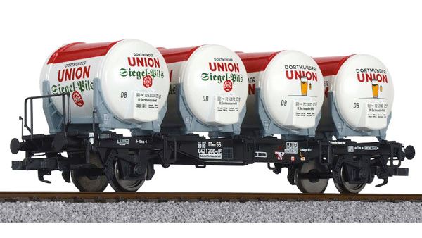 Масштабная модель 2-осного железнодорожного вагона платформы BTms груженной 4-мя пивными бочками Ddikr 624 произведена в полном соответствии оригиналу в историческом и техническом плане. NEM 362 с закрытым механизмом сцепления (KK-Kinematik). Длина по буферам ~126 мм. Окраска модели не требуется. Рекомендуется для железнодорожных макетов, диорам и миниатюр в масштабе 1/87 типоразмера H0.