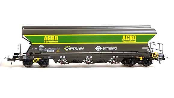 Масштабная модель вагона зернового хоппера (#3784 0764 713-0) «AGRO». Сцепки NEM 362 с закрытым механизмом сцепления. Окраска модели не требуется. Рекомендуется для железнодорожных макетов типоразмера H0 (1:87).