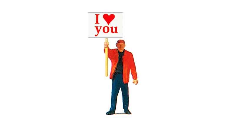 Масштабная модель эксклюзивного дизайна «Мужчина с плакатом «Я люблю тебя» из пластика рекомендуется для диорам в масштабе 1/87 и железнодорожных макетов типоразмера Н0 (1:87). Окраска модели не требуется (цвет и дизайн может отличаться от представленного на иллюстрации).