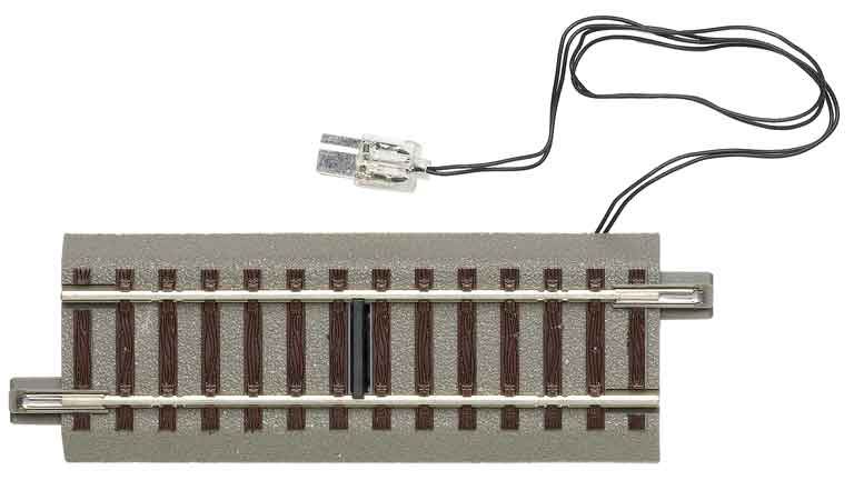 Прямой рельс 100 мм. с электрическим контактом. Рельс 61117 предназначен для срабатывания системы сигнализации или включения питания аксессуаров при прохождении данного участка пути подвижным составом.