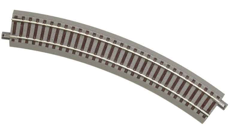Радиусный рельс ROCO geoLINE R3 (434,5 мм 30°) на на прочной пластиковой призме имитирующую железнодорожную балластную насыпь. Шпальная решетка - под дерево. Рекомендуется для железнодорожных макетов в масштабе 1:87 (H0).