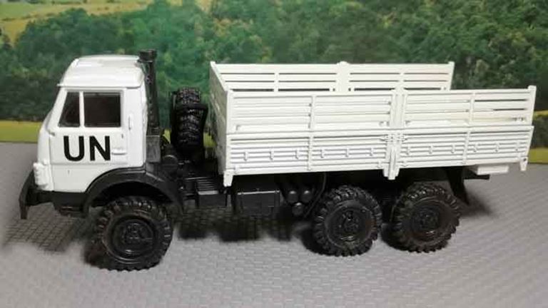 Модель бортового гузового автомобиля КабАЗ 5320 «UN» произведена в соответствии оригиналу в историческом и техническом плане. Окраска модели не требуется (белый цвет). Рекомендуется для железнодорожных макетов, диорам и миниатюр в масштабе 1/87 (H0).