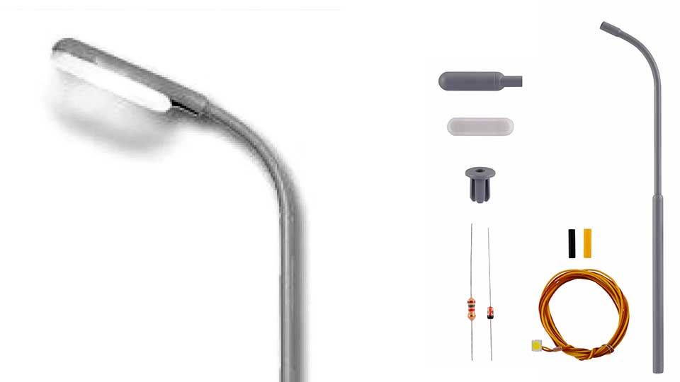 Модель фонаря улинного освещения — набор для самостоятельной сборки. Высота 100 мм. Прозрачная лампа 16В, 30мА., диаметр 2,3 мм. Рекомендуется для железнодорожных макетов типоразмера H0. Возможно размещение в любом месте макета или диорамы.