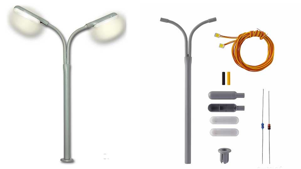 Модель двойного фонаря улинного освещения — набор для самостоятельной сборки. Высота 100 мм. Прозрачные лампы 16В, 30мА., диаметр 2,3 мм. Рекомендуется для железнодорожных макетов типоразмера H0. Возможно размещение в любом месте макета или диорамы.